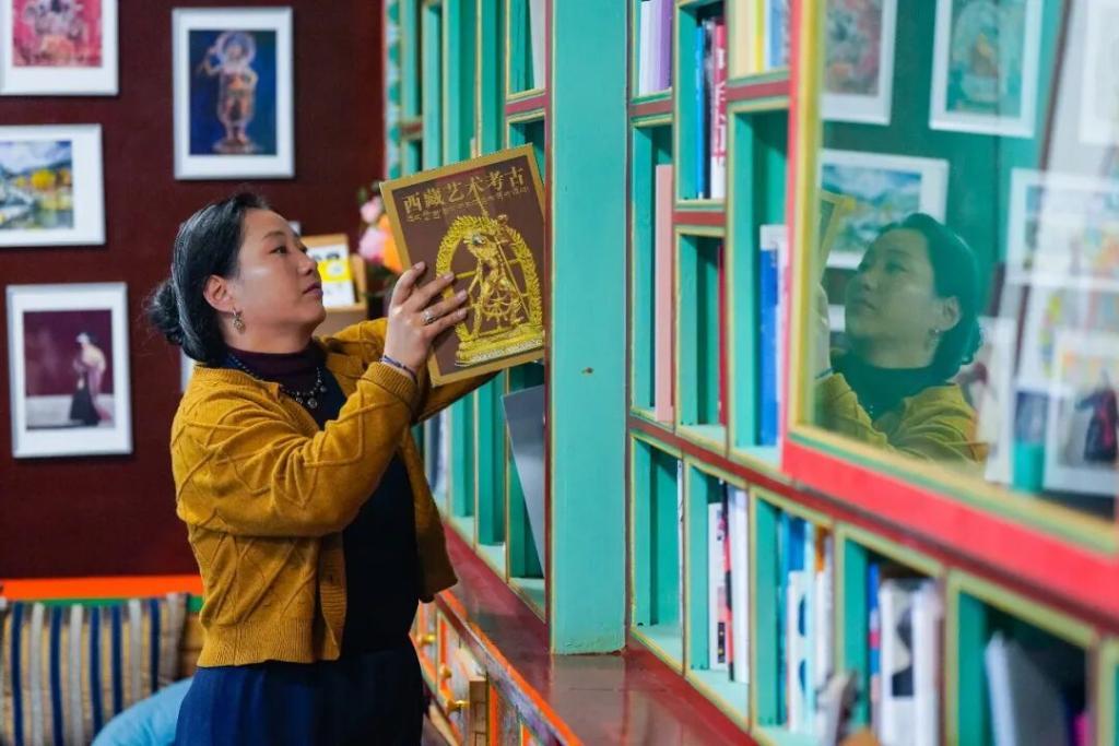 達(dá)瓦卓瑪在“欽樂民宿”公共空間整理提供給住客閱讀的書籍。
