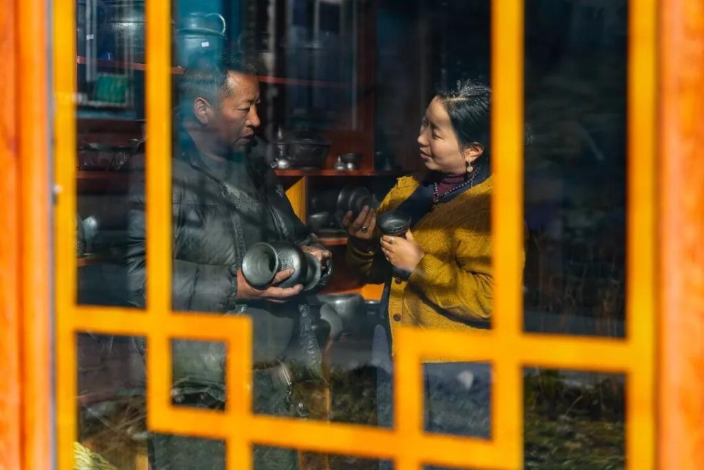 在德格縣麥宿鎮(zhèn)的扎堪倉黑陶工坊,達(dá)瓦卓瑪(右)向工坊主理人降擁格乃了解工坊近期的經(jīng)營情況以及新品研制進(jìn)展。