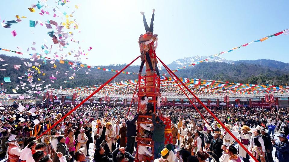 2月25日,農(nóng)歷正月初九,雅安寶興磽磧又迎來一年一度的上九節(jié)。作為當(dāng)?shù)鼐用衿砀P履?、感恩自然的重要?jié)日,上九節(jié)當(dāng)天,當(dāng)?shù)啬信仙俣贾⒀b走出村寨,敲鑼打鼓結(jié)對(duì)而行?;顒?dòng)包括盛大的祈福、民俗巡游,還有各村村民自己編排的精彩節(jié)目。
