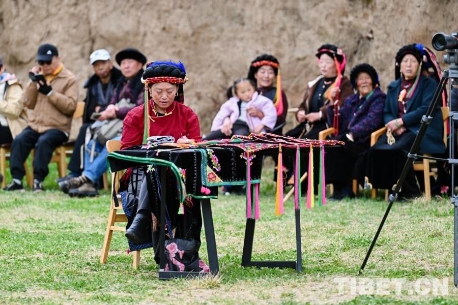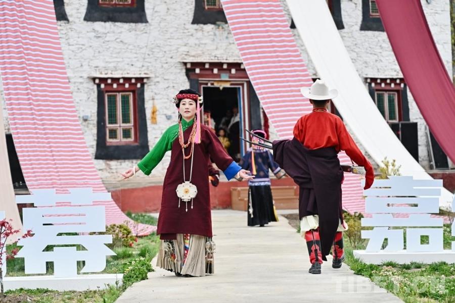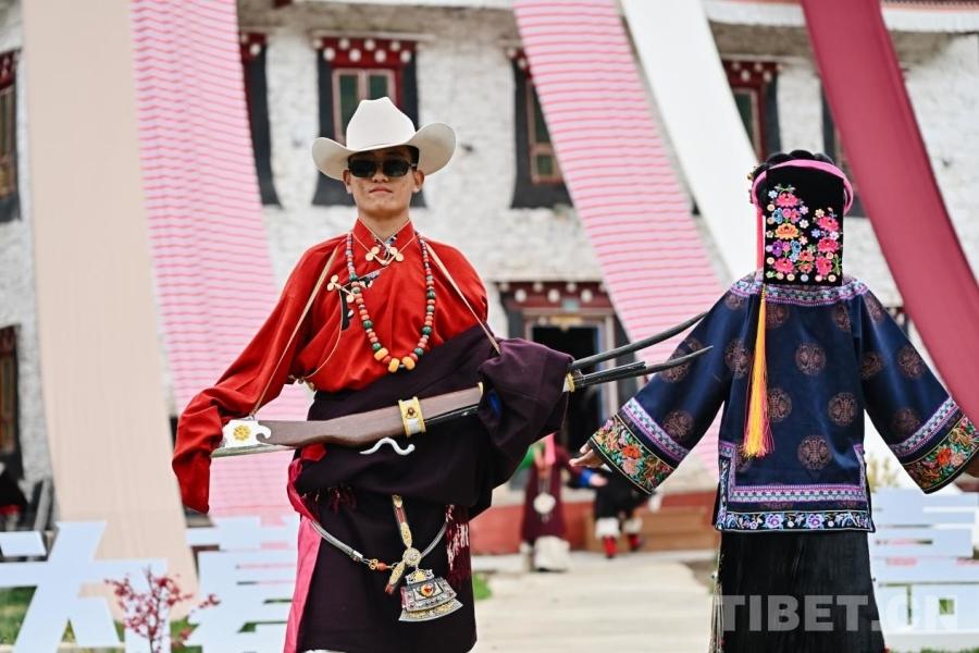 伴隨著輕快的嘉絨山歌,身著傳統(tǒng)嘉絨藏裝的當(dāng)?shù)卮迕窨羁钭邅?。姑娘頭戴造型別致的嘉絨頭飾,身著色彩斑斕的百褶裙,裙擺隨著步伐輕輕搖曳;小伙則身穿長袍,腰系紅綢帶,頭戴白色氈帽,盡顯英武之氣。