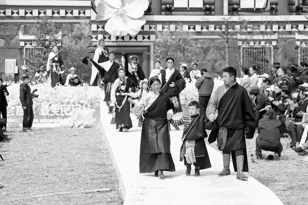 走秀現(xiàn)場,模特們身著融合民族特色的服飾款款走來,自然舒展的步伐與杏花海的詩意氛圍完美契合,將高原兒女的豪邁與靈動展現(xiàn)得淋漓盡致。來自附近村子的四世同堂家庭一同登上秀場,老人穿著親手縫制的傳統(tǒng)服飾,步履緩慢卻從容,讓現(xiàn)場觀眾沉浸式感受到甘孜州民族文化的厚重。
