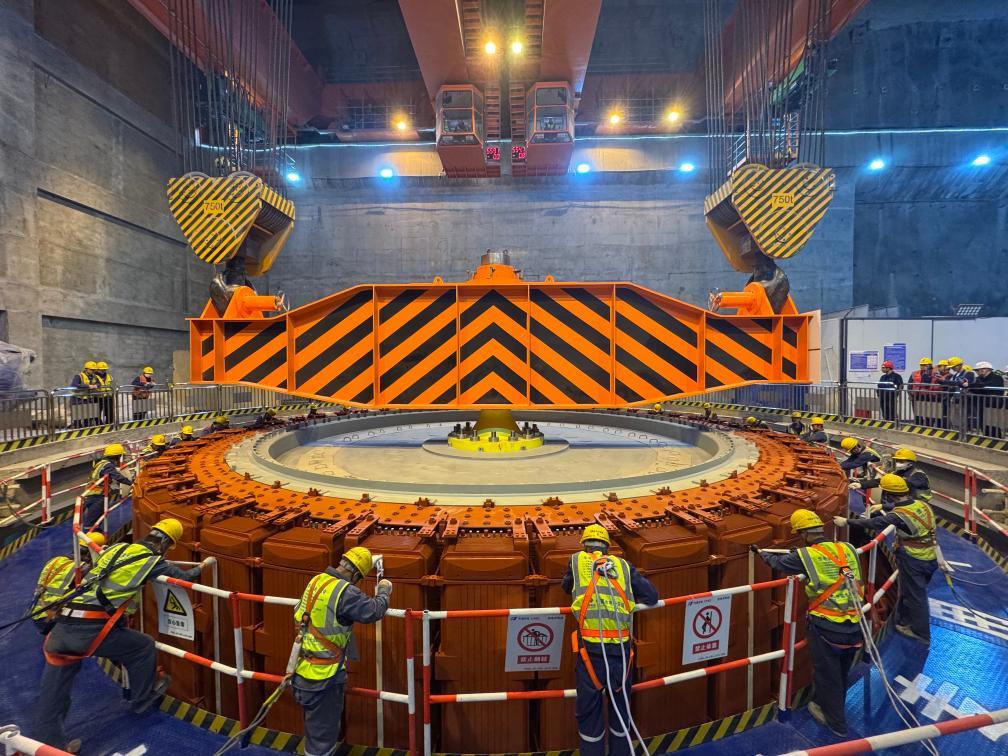 拉哇水電站首臺(tái)機(jī)組轉(zhuǎn)子成功吊入機(jī)坑。(華電金上拉哇分公司供圖)