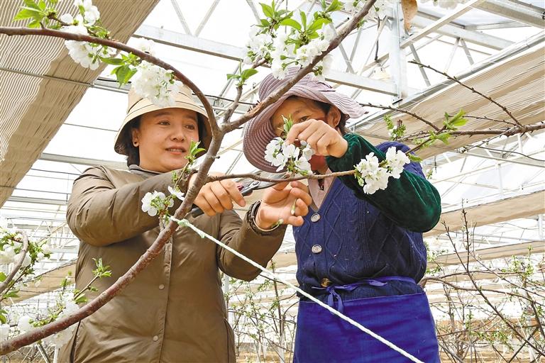 尼木縣“點(diǎn)對(duì)點(diǎn)”干部王榮華(右一)向群眾傳授平谷大桃種植技術(shù)。