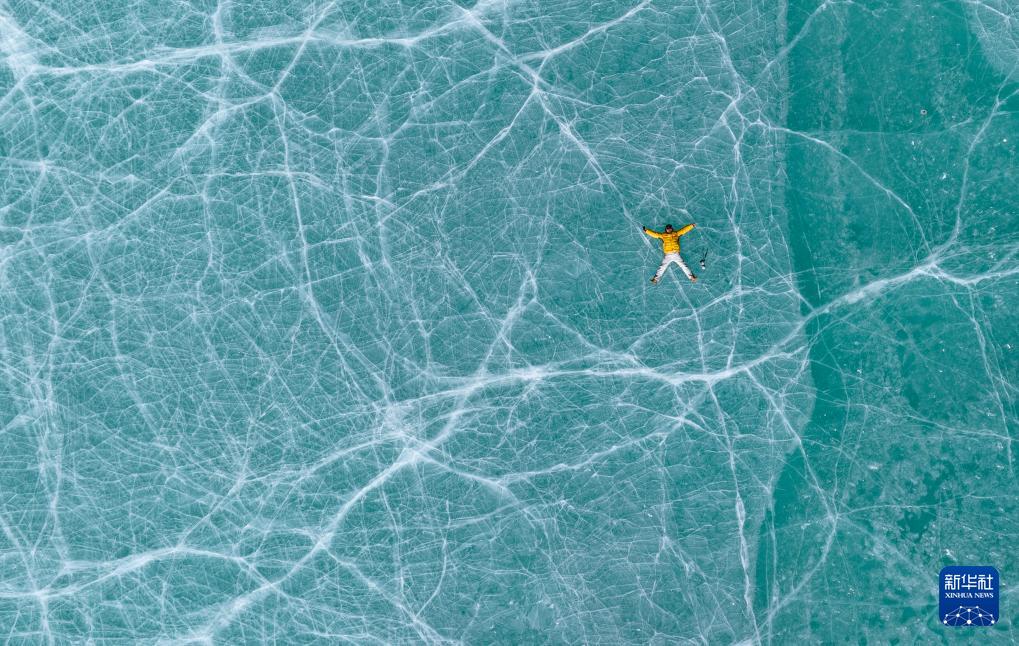 12月7日,一名游客躺在瓊穆崗嘎峰前的冰湖上拍照(無(wú)人機(jī)照片)。新華社記者 丁增尼達(dá) 攝