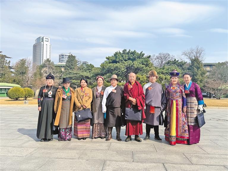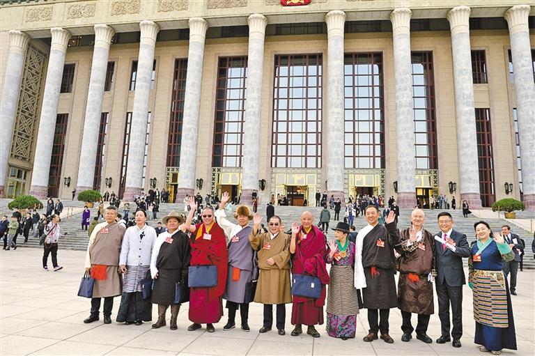 圖為住藏全國政協(xié)委員身著盛裝、滿懷豪情,在人民大會(huì)堂前合影留念。本報(bào)記者 丹增平措 攝