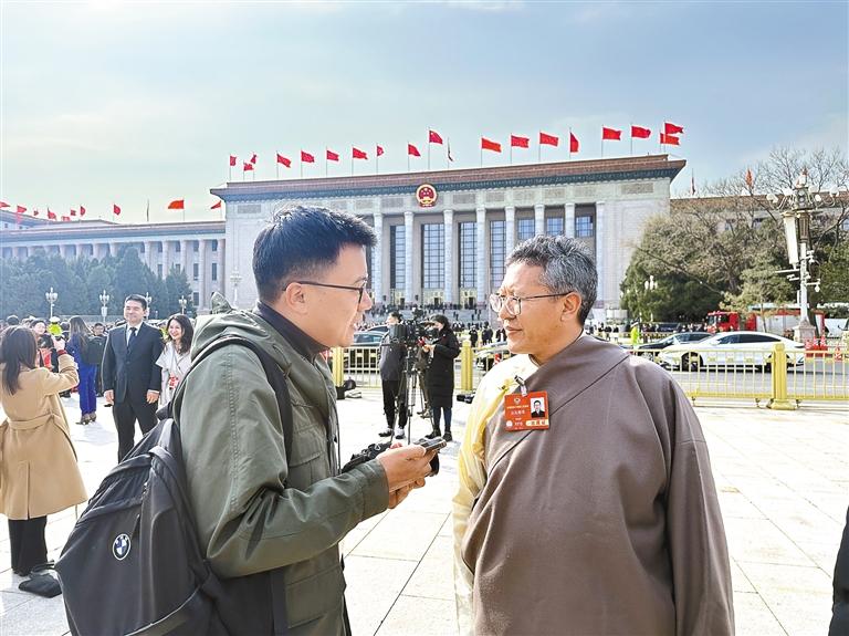 圖為住藏全國政協(xié)委員邊巴拉姆(右)接受媒體記者采訪。本報(bào)記者 丹增平措 攝