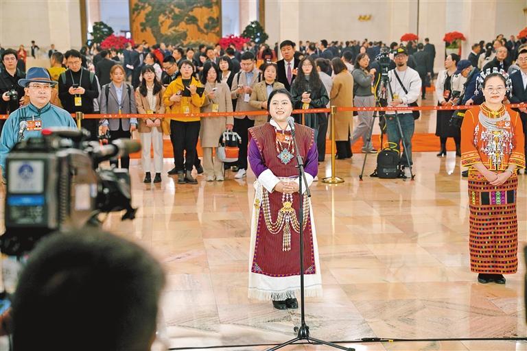圖為住藏全國政協(xié)委員白瑪玉珍(中)在“委員通道”上介紹墨脫的發(fā)展變化。 記者 旦增平措 次旦央吉 攝