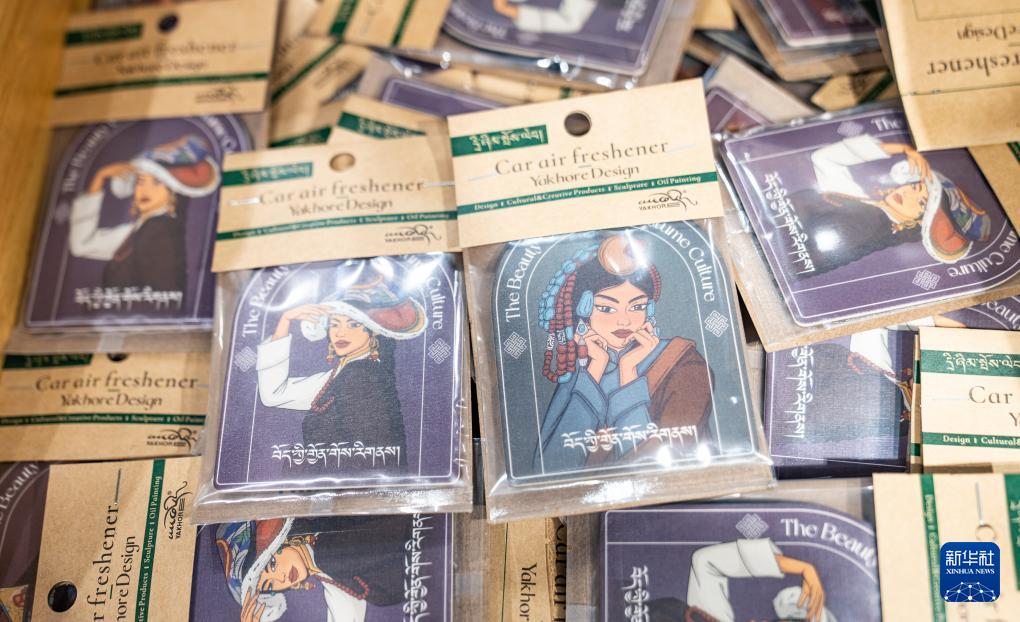 這是在西藏一家文創(chuàng)超市里拍攝的西藏雅闊熱品牌設(shè)計(jì)有限公司設(shè)計(jì)制作的藏裝主題車(chē)掛香片(9月29日攝)。新華社記者 丁增尼達(dá) 攝??
