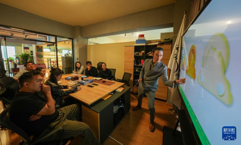 在西藏雅闊熱品牌設(shè)計(jì)有限公司,扎西巴單(右一)和同事們?cè)陂_(kāi)會(huì)(9月16日攝)。新華社記者 晉美多吉 攝