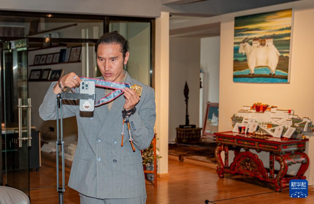 在西藏雅闊熱品牌設(shè)計(jì)有限公司,扎西巴單在直播推介文創(chuàng)產(chǎn)品(9月16日攝)。新華社記者 丁增尼達(dá) 攝??
