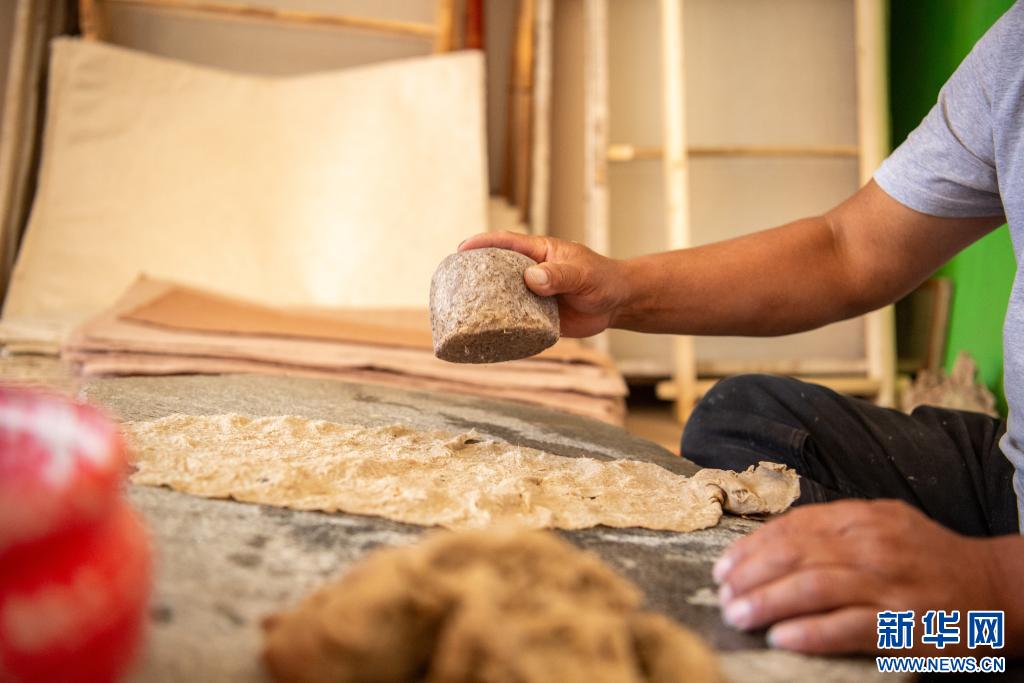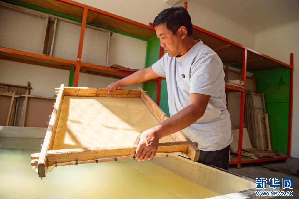 10月16日,格桑旦增的弟弟普瓊在進行澆造、抄紙工藝。新華網(wǎng) 旦增努布 攝