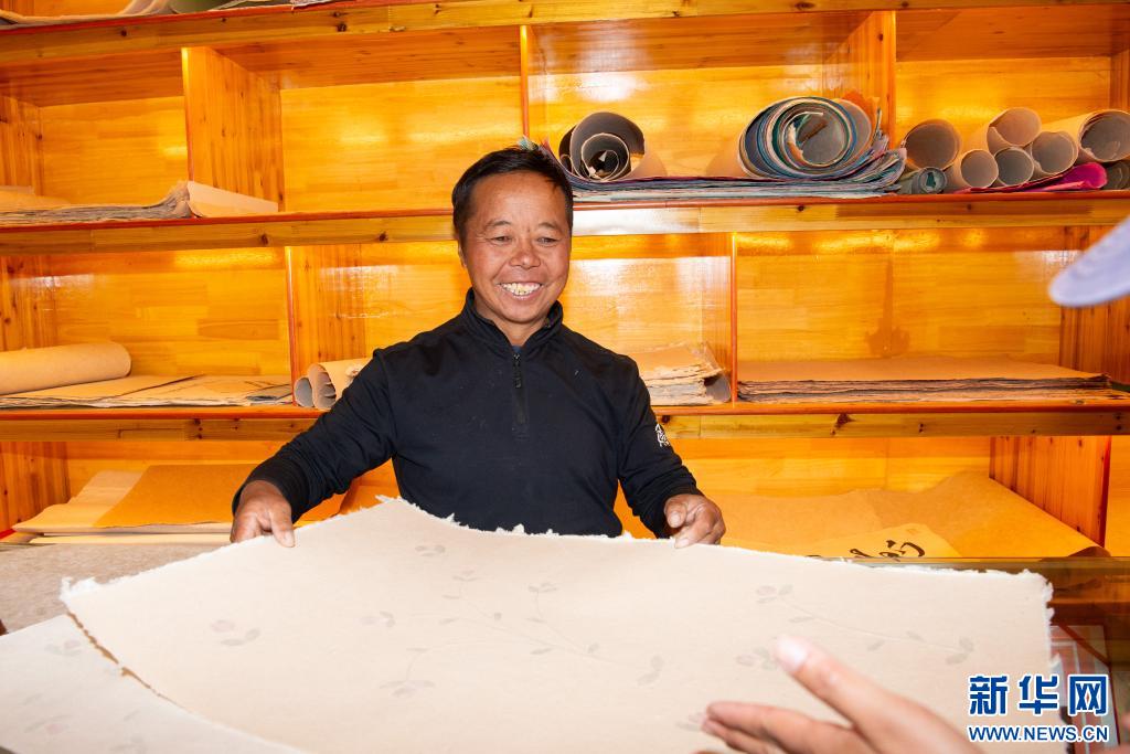10月16日,格桑旦增在檢查藏紙的質(zhì)量。新華網(wǎng) 旦增努布 攝