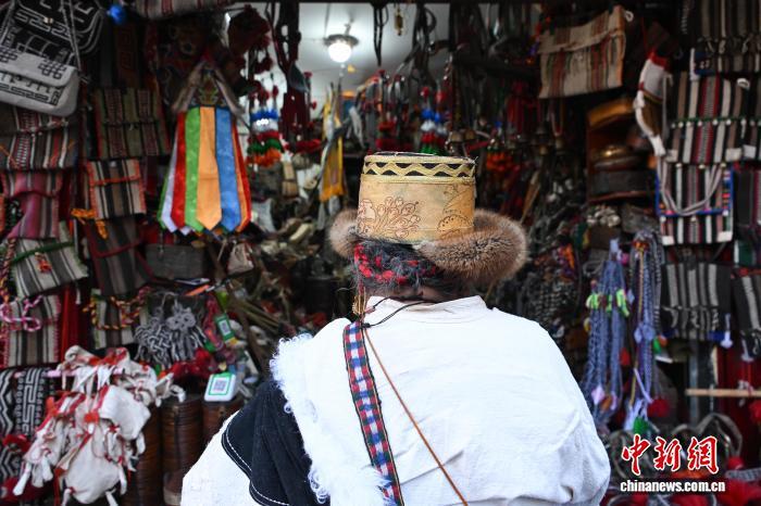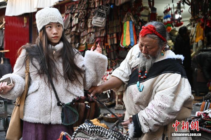 中國藏族網(wǎng)通訊 12月9日,西藏拉薩市八廓街沖賽康旁的背陰巷口,55歲店主次仁羅布的藏式老物件小店熱鬧非凡。不足30平方米的空間里,烏朵、馬包、藏式氆氌側掛包等好物琳瑯滿目,既有時光沉淀的老物件,也有手藝人新制精品。小店吸引本地民眾、年輕人及游客紛紛選購,生意紅火。圖為游客選購藏式氆氌側掛包。中新社記者 貢嘎來松 攝