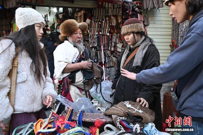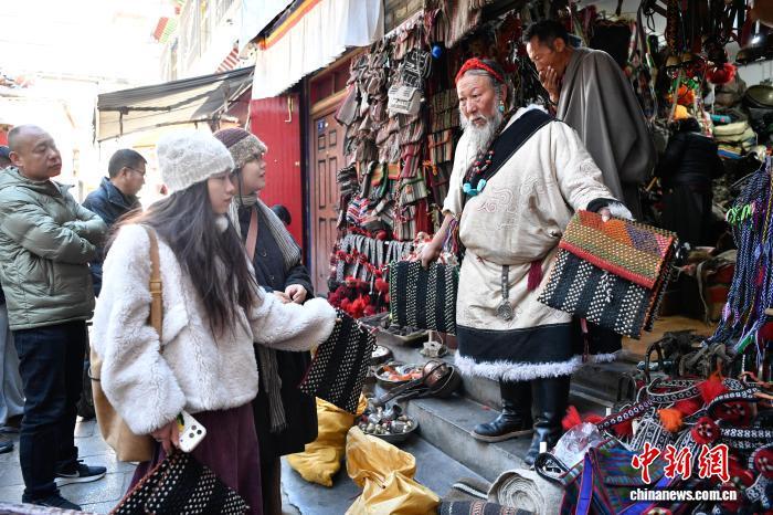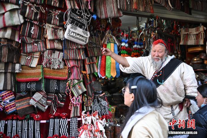 圖為藏式老物件店主次仁羅布給游客推薦藏式氆氌側掛包。中新社記者 貢嘎來松 攝