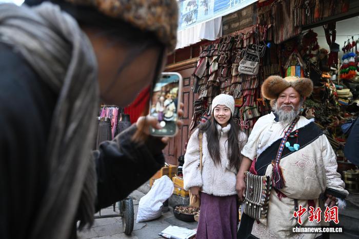 圖為藏式老物件店主次仁羅布與游客合影。中新社記者 貢嘎來松 攝