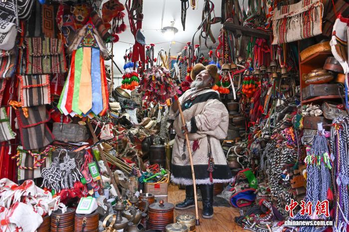 圖為次仁羅布在藏式老物件小店內(nèi)工作。中新社記者 貢嘎來松 攝