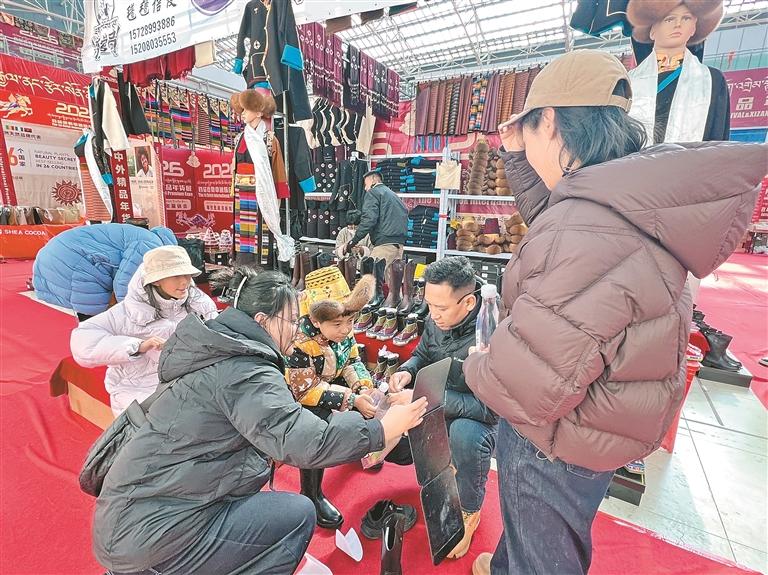 圖為市民在博覽會(huì)上為孩子選購(gòu)藏帽、藏靴。本報(bào)記者 央金 攝