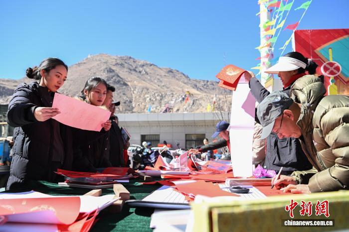 圖為書(shū)法家免費(fèi)給村民寫(xiě)對(duì)聯(lián)。中新社記者 貢嘎來(lái)松 攝