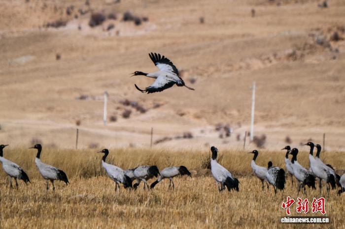 2月8日,一群越冬黑頸鶴飛過(guò)拉薩市林周縣春堆鄉(xiāng)卡東村上空。中新社記者 江飛波 攝