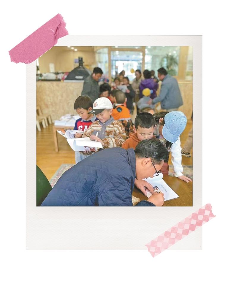 圖為嘎瓦占堆在繪本作品上為小讀者簽名。(圖片由受訪者提供)