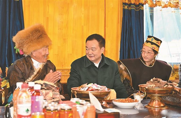 中華民族傳統(tǒng)節(jié)日春節(jié)剛過(guò),雪域高原又迎來(lái)了藏歷新年初二,家家戶戶回蕩著“羅薩扎西德勒”的溫馨祝福?!斑^(guò)年了,祝你們新年快樂(lè)、身體健康、吉祥如意!”王君正走進(jìn)魯朗鎮(zhèn)扎西崗村77歲的老黨員、致富帶頭人平措家里,嶄新的香布、整潔的小院,切瑪斑斕、卡塞飄香,家里充滿濃濃的年味兒?!吧眢w怎么樣?”“民宿生意好不好?”在暖意融融的客廳里,王君正和老人聊家常,詢問(wèn)身體狀況及家庭收入等情況,隨后走進(jìn)平措家的民宿旅館,從價(jià)格、住宿條件到屋外山景,看得仔細(xì)、問(wèn)得深入。了解到在以習(xí)近平同志為核心的黨中央親切關(guān)懷下,扎西崗村發(fā)生了翻天覆地的變化,平措一家借助本地旅游資源,開(kāi)民宿、做餐飲,年收入不斷增加,日子越過(guò)越好,王君正為他們的發(fā)展感到由衷高興、為他們的幸福生活點(diǎn)贊。他說(shuō),“看著北斗星走不迷路、跟著共產(chǎn)黨走會(huì)幸?!?,這些好日子,離不開(kāi)以習(xí)近平同志為核心的黨中央對(duì)西藏工作的高度重視、對(duì)西藏各族人民的深切關(guān)懷,大家要感恩總書(shū)記、感謝黨中央,更加堅(jiān)定不移聽(tīng)黨話、感黨恩、跟黨走;黨員要發(fā)揮先鋒模范作用,發(fā)揚(yáng)黨的光榮傳統(tǒng)和優(yōu)良作風(fēng),帶領(lǐng)村民用勤勞的雙手把家園建設(shè)得更加美好,把日子過(guò)得更加甜蜜。