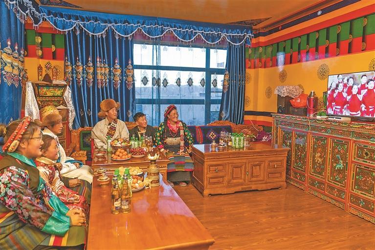 2月16日,長所鄉(xiāng)古榮村村民桑杰一家在新居里觀看春晚。