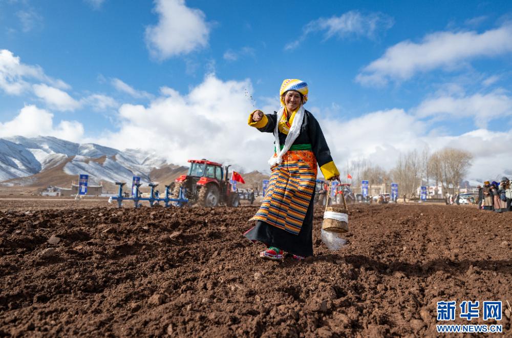 3月16日,身著節(jié)日盛裝的群眾在西藏拉薩市林周縣春堆鄉(xiāng)春堆村的農(nóng)田上播撒青稞種子。新華網(wǎng) 旦增努布 攝