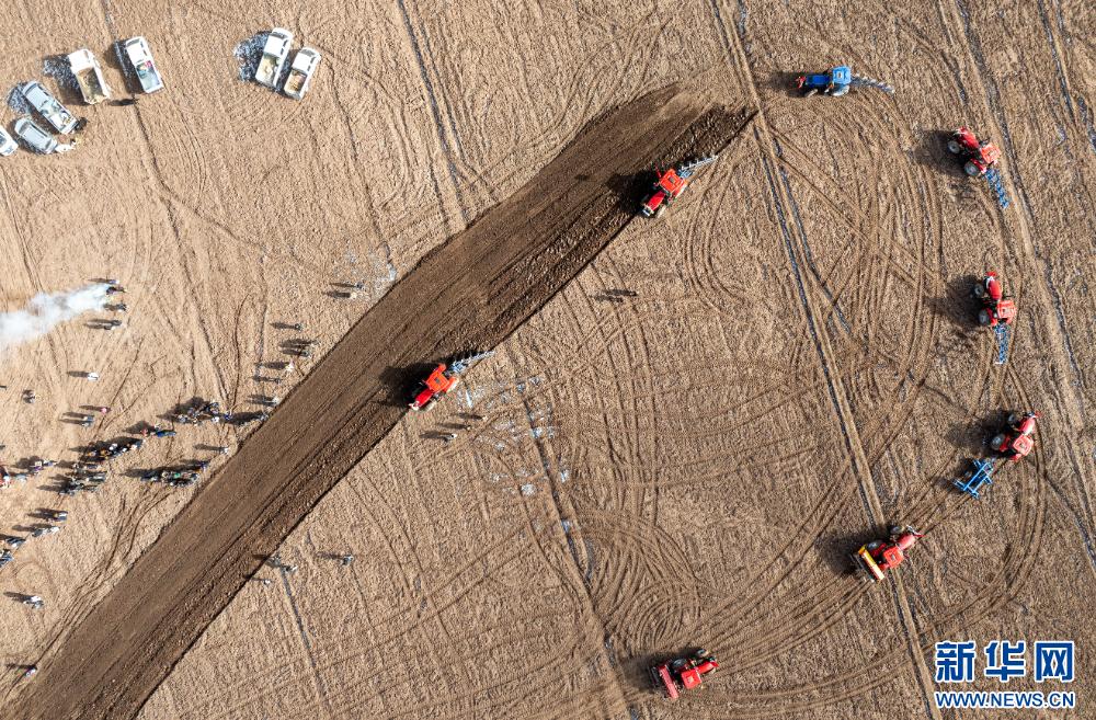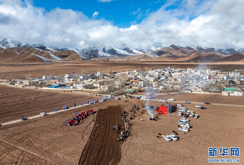 3月16日,西藏拉薩市林周縣春堆鄉(xiāng)春堆村的春耕儀式現(xiàn)場(無人機照片)。新華網(wǎng) 旦增努布 攝