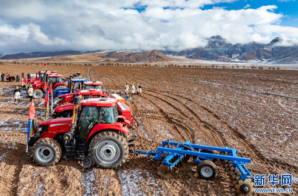 3月16日,在西藏拉薩市林周縣春堆鄉(xiāng)春堆村春耕儀式上,當?shù)厝罕姲凑諅鹘y(tǒng)的“二牛抬杠”耕作方式翻土犁地,開啟春耕第一犁。新華網(wǎng) 旦增努布 攝