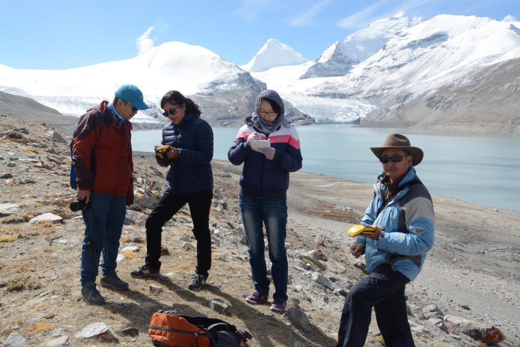 扎西央宗(左二)和團(tuán)隊(duì)成員在日喀則桑旺錯(cuò)冰川進(jìn)行數(shù)據(jù)采集。(受訪單位供圖)