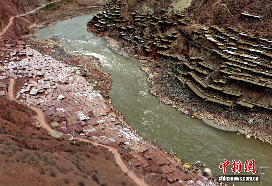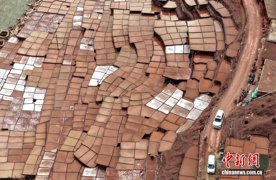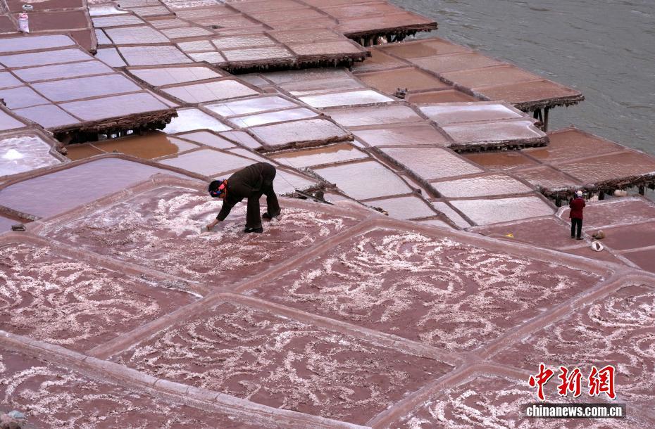 3月24日,西藏昌都市芒康縣境內(nèi)的千年古鹽田猶如大地藝術(shù)畫卷。瀾滄江畔,數(shù)千塊鹽田錯落分布兩岸。當(dāng)?shù)孛癖娮裱爬蟼鹘y(tǒng),引水曬鹽,距今已有1300多年的歷史。圖為當(dāng)?shù)孛癖娫邴}田勞作。中新社記者 李林 攝