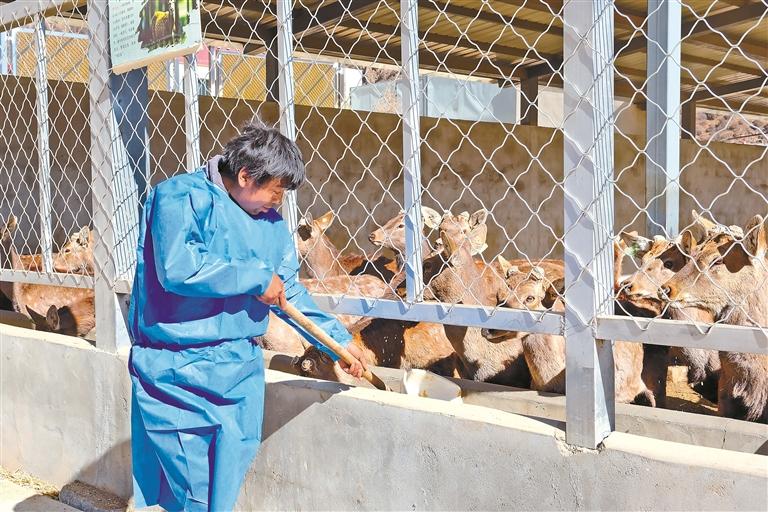 基地工作人員正在往鹿舍食槽里補(bǔ)充干飼料。本報(bào)記者 謝筱純 攝