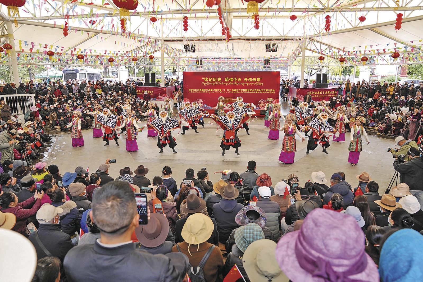 3月28日,人們在拉薩市宗角祿康公園觀看西藏百萬農(nóng)奴解放紀(jì)念日群眾文藝演出活動。 3月28日,西藏各族群眾,升國旗、唱國歌,載歌載舞,隆重紀(jì)念西藏百萬農(nóng)奴解放67周年。 新華社記者 晉美多吉 攝