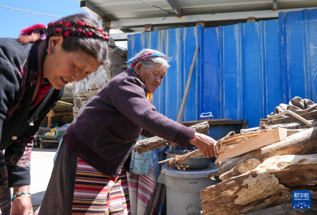 次仁桑姆(右)和女兒在整理家里的木材堆(3月26日攝)。新華社記者 晉美多吉 攝