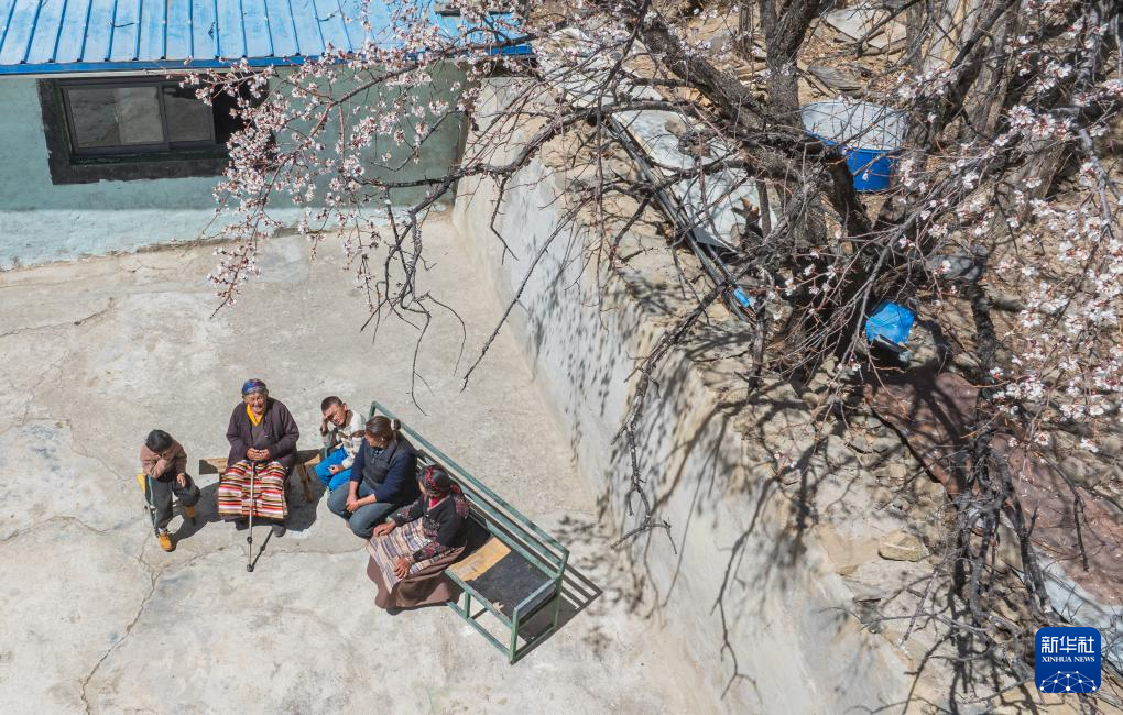 3月26日,次仁桑姆(左二)和晚輩在宗卡村家中的院子里聊天(無人機照片)。新華社記者 丁增尼達 攝