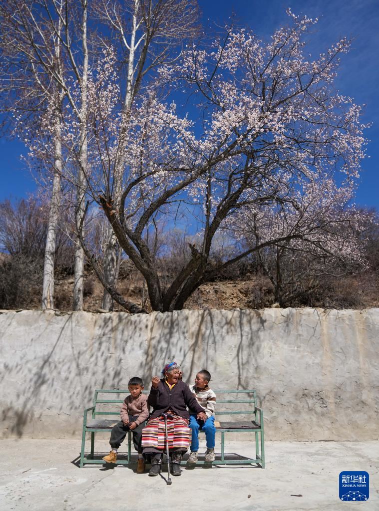 次仁桑姆(中)和兩位晚輩在宗卡村家中的院子里聊天(3月26日攝)。新華社記者 晉美多吉 攝