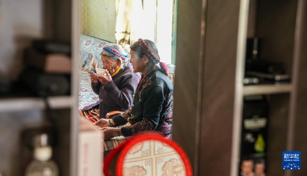 次仁桑姆(中)和兩位晚輩在宗卡村家中的院子里聊天(3月26日攝)。新華社記者 丁增尼達 攝