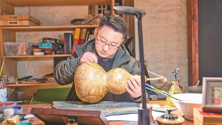 就像做掐絲葫蘆,他會(huì)先有線稿,但最終會(huì)根據(jù)葫蘆本身的形狀與色澤,讓唐卡圖案與掐絲紋樣在制作中相互調(diào)整、逐步呈現(xiàn)?!熬拖癫菰系暮?,它有它的流向,你只需順著它的流勢,稍加引導(dǎo)就好?!边@種“因材施藝、順勢而為”的創(chuàng)作態(tài)度,讓他的作品既有手作的溫度,又透著一股生動(dòng)的自由。