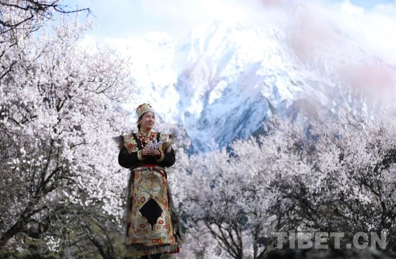 身著嘉黎特色服飾的姑娘,手捧桃枝,在雪山花海的映襯下,喜迎遠方來客。