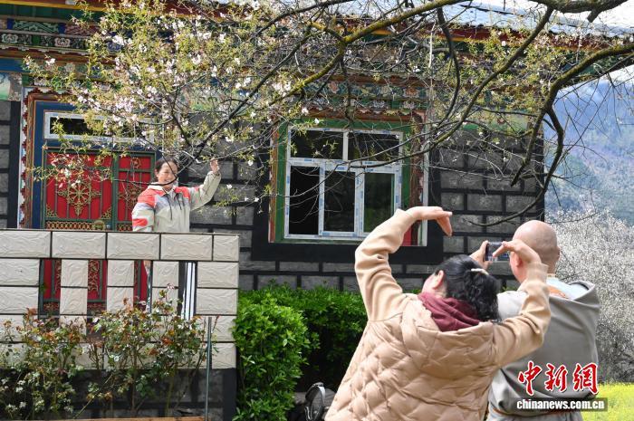 圖為游客在索朗拉宗家庭旅館院內(nèi)的桃樹下拍照留念。謝牧攝