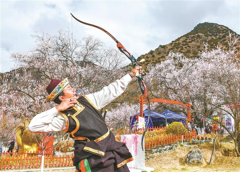 群眾在桃花園表演工布響箭。本報(bào)記者 劉楓 攝