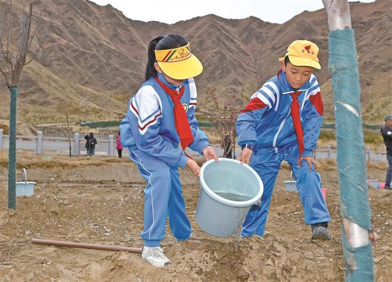 拉薩市第一小學(xué)學(xué)生在城關(guān)區(qū)慈覺(jué)林植樹點(diǎn)參加春日植樹活動(dòng)。本報(bào)記者 潘多 洛?!z