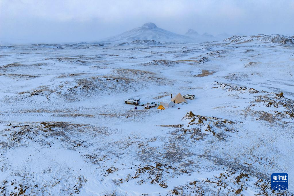 4月11日,羌塘國家級自然保護區(qū)那曲地區(qū)管理局專業(yè)管護隊在“巴毛窮宗”地區(qū)雪中宿營(無人機照片)。新華社記者 姜帆 攝