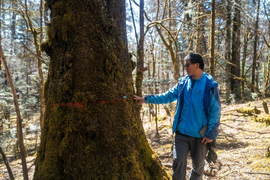 云南麗江森林生物多樣性國家野外科學(xué)觀測(cè)研究站工程師范中玉在云杉坪大樣地內(nèi)查看一棵杉樹(2024年3月28日攝)。新華社記者 陳欣波 攝