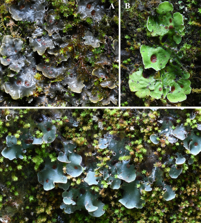 此次發(fā)現(xiàn)的扁盤(pán)衣屬新物種野外生境圖:A.褐肝扁盤(pán)衣,B.盾形扁盤(pán)衣,C.薄葉扁盤(pán)衣。(受訪者供圖)