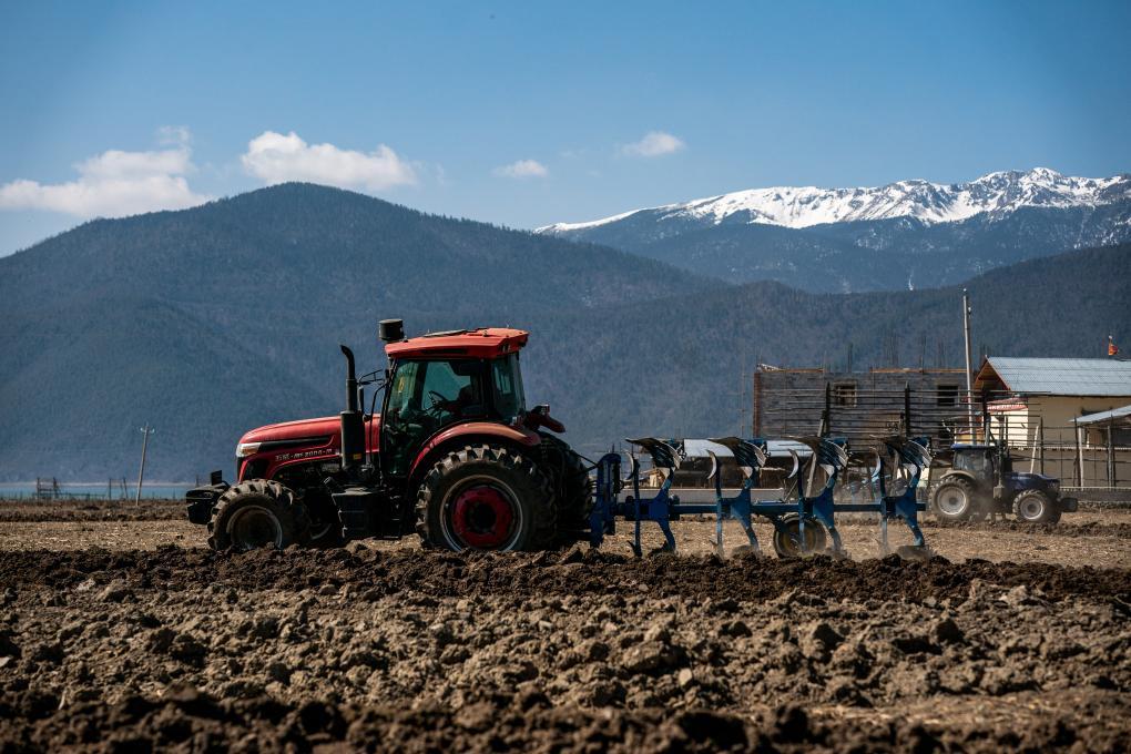 2023年3月8日,在香格里拉市建塘鎮(zhèn),農(nóng)民駕駛農(nóng)用機(jī)械犁地。新華社記者 胡超 攝