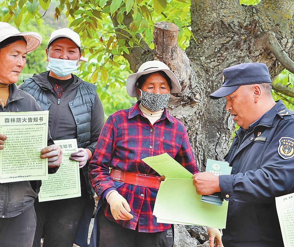 江巴次成(右)向村民宣講防火知識。 本報記者 貢秋次仁 攝