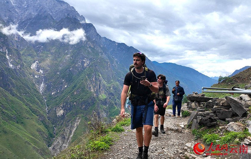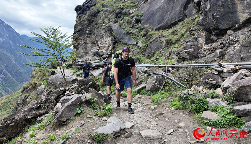 外國(guó)游客在虎跳峽徒步。人民網(wǎng)記者 莊志斌 攝