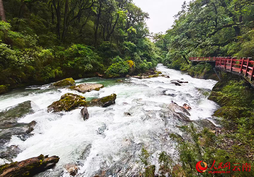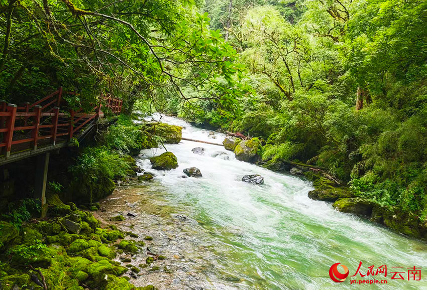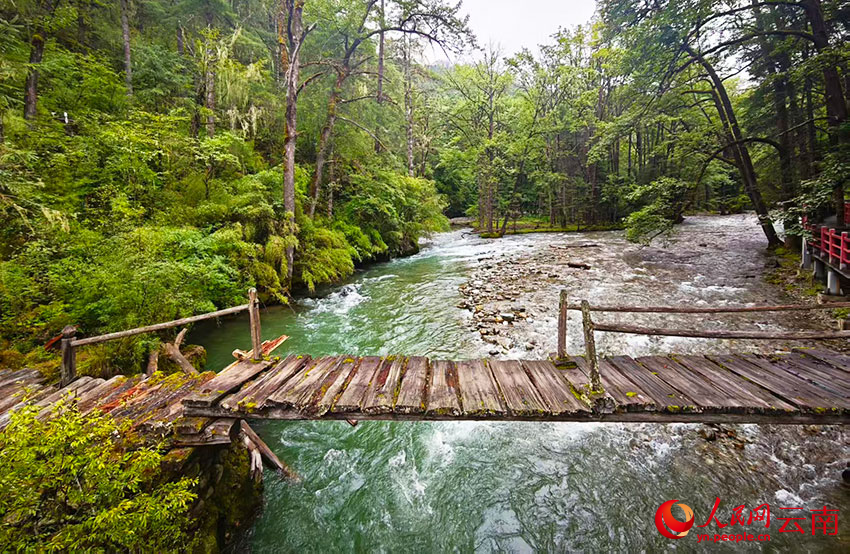 從尼汝村出發(fā),小路和棧道隨尼汝河蜿蜒延伸。河水如碧綠絲帶穿林而過(guò),水流撞擊礁石的聲響與林間鳥(niǎo)鳴交織成天然交響曲。河岸兩側(cè)云杉與冷杉高聳入云,樹(shù)干上的松蘿隨風(fēng)輕擺,陽(yáng)光透過(guò)枝葉灑下斑駁的光影。