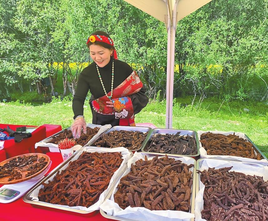 拉姆央宗向游客介紹牦牛肉干。
